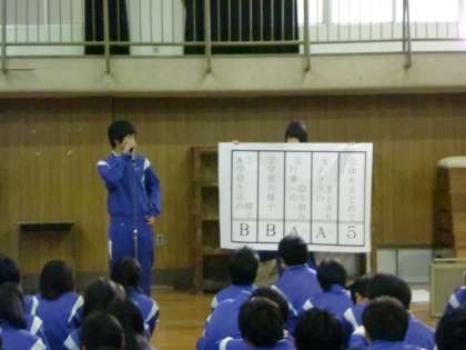 3年生では、学級委員が「クラスの通知表」として、学級の取り組み状況と課題を述べました。