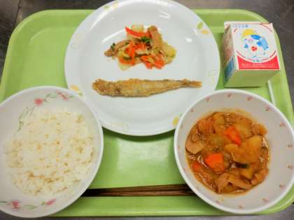 1番うれしかったことは、過去最高に「ししゃも」の残菜が少なかったことです。5月から毎月ししゃもを出しているのですが、これまでは7〜9%の残菜率が続いていました。しかし、今日は空っぽのクラスがいくつもあったので、ようやく「ししゃも」を子供たちが受け入れてくれた感じがします。調理員さんと一緒に給食室で喜びました!