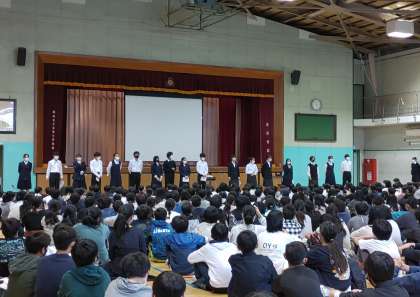 この後、砧中紹介、校内見学などを行います。砧中のことをよく知っていただくために、生徒会役員、2年生学級委員が頑張っています。(副校長)
