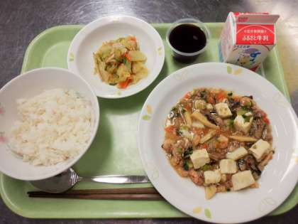 今日は新メニューの「豆腐とえびのうま煮」です。豚肉、玉ねぎ、たけのこ、にんじん、干し椎茸を炒めていき、ガラスープ、塩、薄口しょうゆ、酒を入れて煮ます。その後、オイスターソースと豆板醤を入れて煮込み、えび、いか、チンゲン菜、万能ねぎ、事前に湯通しした大量の豆腐を加えて再び煮込みます。最後に水溶きでん粉とごま油を加えて完成です!肉と野菜、魚介のうま味が合わさった、とても美味しい中華風の煮込み料理です。1人分の量は多いのですが、欠席の多いクラスでもよく食べてくれていたので、気に入ってもらえたようです。