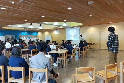 各グループが作成した行きたい校外学習先の発表を見ています。あらかじめ編集し、コメントも録音してあります。