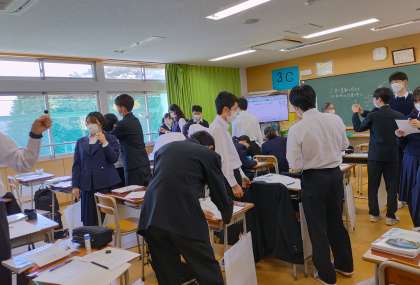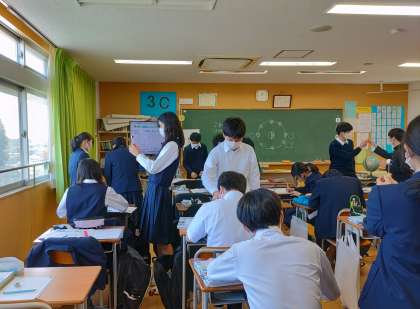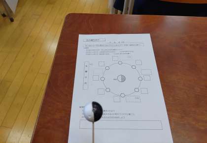 2人一組で月と地球の役割をします。地球から月がどのように見えるのか、簡単な実験ですがよくわかりますね。