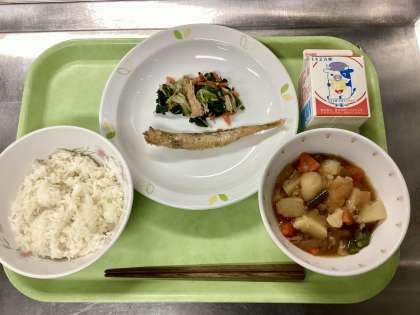 今日は肉じゃがです。長崎地方では、江戸時代からじゃが芋が栽培されていたので、その頃からすでに肉じゃがのような料理があったそうです。大阪、東京でもじゃが芋と肉を似合わせた料理が昔から食べられており、いつの間にか「肉じゃが」という名前が定着し、全国の家庭で一般化したそうです。由来からも、昔から人々に親しまれていたのがわかります。これまで給食ではコチュジャンとごまを入れた「韓国風」、カレー粉を入れた「カレー肉じゃが」と出してきましたが、今日はシンプルに砂糖、醤油、みりん、酒で甘辛く煮込みました。