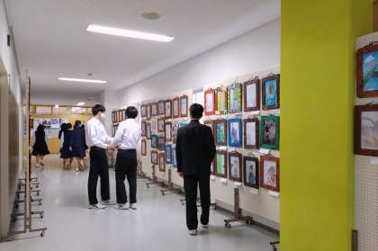 明日からの教育相談期間に合わせて展示している3年生の額を見ている生徒もいますね。見応えのある作品です。(副校長)