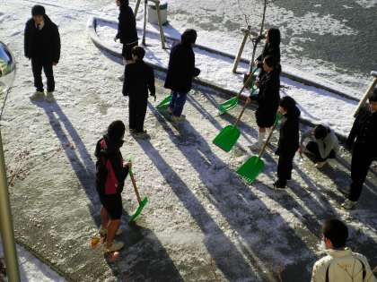 途中から、朝練で登校したバドミントン部の生徒たちも雪かきを手伝いました。