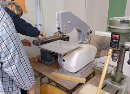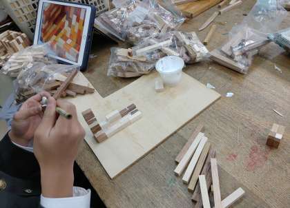 様々な色の木材を組み合わせて自分のイメージする作品を目指しています。周囲に磨きをかけるときれいな木目が出てきますね。(副校長)