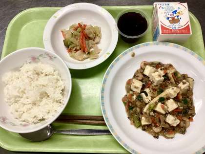 今日のメインは「豆腐とえびのうま煮」です。野菜は玉ねぎ・たけのこ・人参・チンゲンサイ・万能ねぎです。肉は「豚ひき肉」に鉄分補給のための「豚レバーミンチ」を混ぜた物と、肉の存在感を出すために豚肩ロースの小間切れも使っています。肉と野菜を炒めたら、給食室で煮出した「鶏ガラスープ」を加え、煮込みながら干し椎茸・塩・薄口しょうゆ・酒・オイスターソース・豆板醤を入れていきます。その後、豆腐とえび、いかを加えて少し煮たら、最後の仕上げとして万能ねぎ、水溶き片栗粉、ごま油を加えます。肉・野菜・魚介・干し椎茸のそれぞれがもつ旨味が口の中で合わさって「相乗効果」を生み出し、より深い美味しさを出してくれます。ほんのりピリ辛な味も中学生向きです。さらなる美味しさを目指してもう少し辛味を強くした方がいい気がしつつも、辛いのが苦手な人がいることも考えて、次回は豆板醤の量を10gだけ増やして作ってみたいと思います。