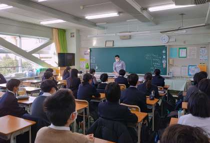 写真は、1年生が生徒会朝礼の話を聞いている様子です。(副校長)