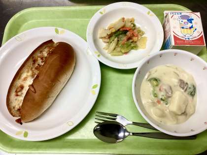 今日はチリビーンズドッグ、オニオンドレッシングサラダ、豆乳クリームシチューです。