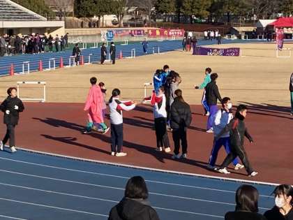 砧中女子チームも、1区の選手がコーチの指示を仰ぎなからアップ開始しています!