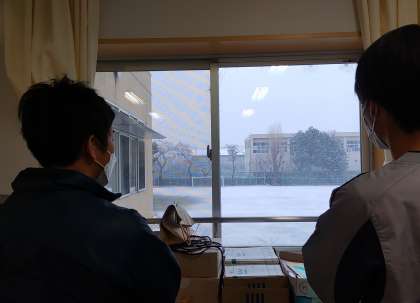 雪が降り積もる校庭を見つめる体育科教員