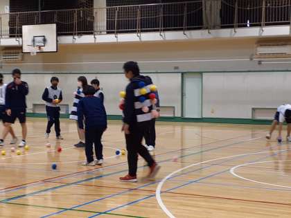 I組は、社会のテストの後にニュースポーツ体験会を行っています。