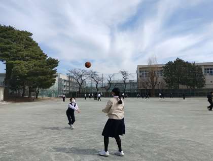 あれ、バスケットボールでバレーボールをしていますね。