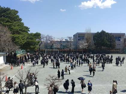 校庭には名残を惜しむ卒業生、保護者の皆様の姿があります。