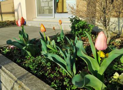 朝日を浴びたチューリップが可愛らしいですね。