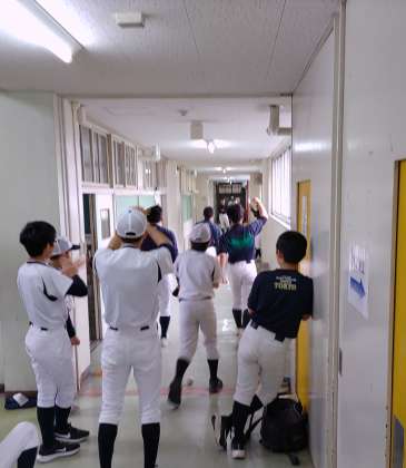 野球部が廊下でトレーニングをしています。お互いを励ます声掛けがとてもいいですね。(副校長)