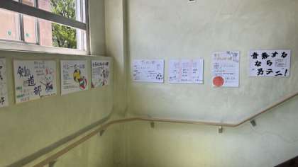 校舎を歩いていると、きれいなポスターがあちこちにあります。授業は大縄ですね。楽しそうです。