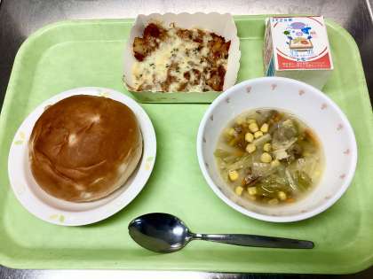 今日はパン・グラタン・スープのメニューです。砧中では定番の組み合わせです。このメニューの利点は、配膳しやすい・食べやすい・片付けやすいことです。