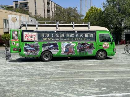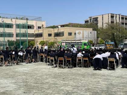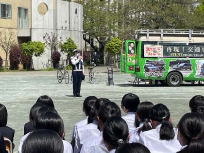 4月13日3校時、スタントマンが事故を再現し交通安全の意識を高める取り組みです。まもなく始まります。