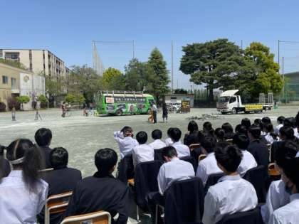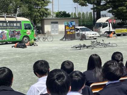 自転車が事故となる多くのケースを実演していただきました。最後に代表生徒によるお礼の言葉に自転車のヘルメット努力義務の話もありました。今回のスケアードストレートで学んだことを日々の生活に活かし事故のないように気をつけて生活していきましょう。