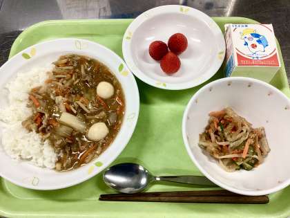今日は野菜たっぷり中華丼です!味見をしたらなんとびっくり!!今までで1番コクのある深い味になっていました。中華丼はカレーライスなどとは違い、スパイスは無しで塩・醤油などの調味料と素材の味だけで美味しくしないといけません。生徒たちが美味しく食べられるように、これまで何度も味の改良を行ってきました。豚肉を柔らかい豚肩ロースにしたこと、生姜の量を増やして香りを強くしたこと、イカは青森県産のプリプリした新鮮な物にしたこと、そしてうずら卵やえのきなどの具材の量を多くし過ぎないように気をつけて、水溶きでん粉の量を減らして少しとろみを弱くしたこと、これらの変更点がプラスに働いたおかげかと思います。また、調理員さんの丁寧な調理作業もあってこそ!!