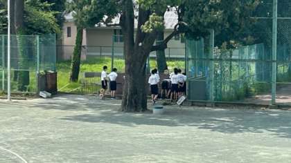 体育の授業の休息、給水です。I組も元気そうです。