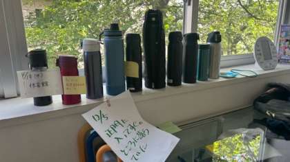 暑いですね。衣服で調整したり、水筒を準備して対策しましょう。職員室前には落とし物の水筒がたくさんあります。早く取りに来てくださいね。