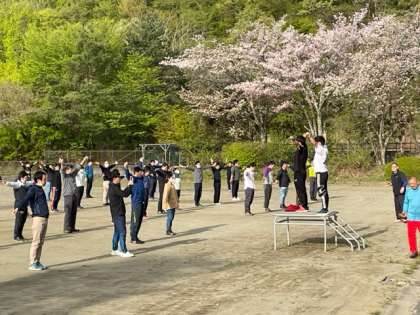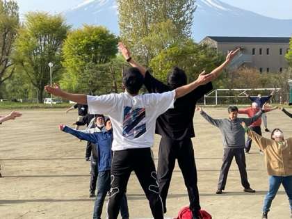 河口湖林間学園の朝会はラジオ体操で始まります。先生たちも本番と同じようにラジオ体操に取り組んでいます。