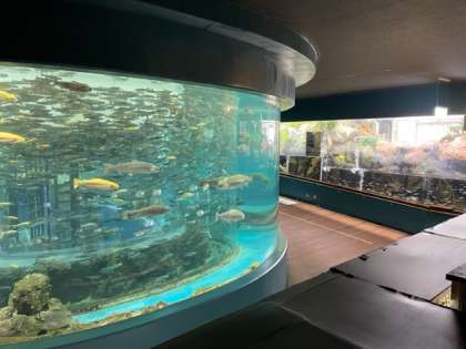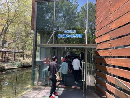 富士山レーダードーム館の次に、富士湧水の里水族館の見学です。ニジマスやチョウザメが回遊する水槽となっているので、その様子は圧巻です。カエルやカヤネズミたちにも会えます。