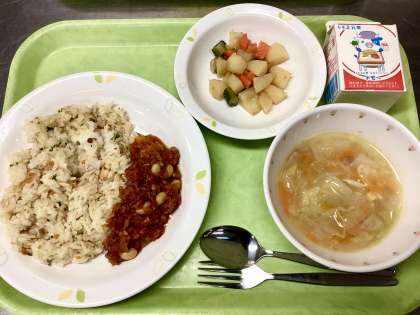 チリコンカンは、ひき肉・玉ねぎ・人参を炒めて、トマト缶と調味料を加えます。トマトの酸味が飛ぶように煮込むのですが、途中でガラスープを加えてさらに煮込み、混ぜることで乳化を起こし、料理としてのまとまりを出させます。最後に茹でた大豆、チリパウダーやパプリカなどの香辛料を加えれば完成です。この作り方、レシピは今年の2月14日の給食で、前任の調理チーフと一緒に相談しながら生み出した調理法です。今日は、4月から赴任した新しいチーフが、見事に美味しく仕上げてくれました!!新しいチーフは早くも砧中の生徒の好みを見抜き始めているように思います。