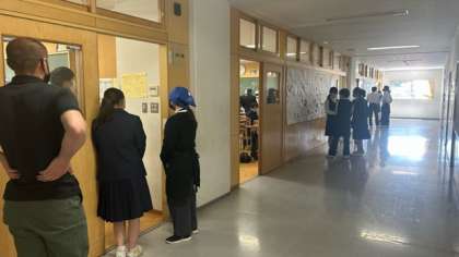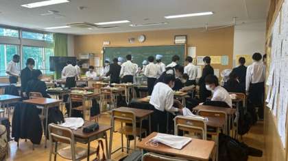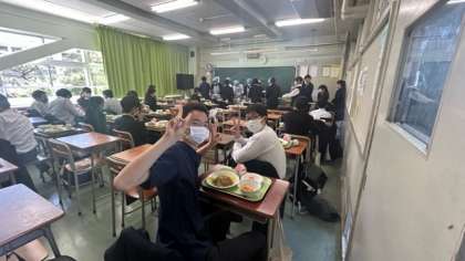 お昼の放送でBTSが流れています。給食、おいしそうです。