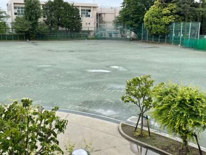 予報通りに午前中で雨は止みましたが校庭には水たまり。