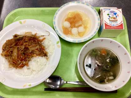 サムゲタン風スープは、韓国の「参鶏湯(サムゲタン)」を参考に作りました。夏を乗り切るため、様々な野菜と漢方を使うようで、さらに鶏肉にもち米を詰めて煮込むことで、とろみをつけるそうです。さすがに子供たちが食べる給食で「漢方」やら「鶏肉に詰める」などは無理なので、にんにくと鶏ガラからダシをとり、チンゲン菜や大根などの野菜と干し椎茸、鶏もも肉を煮込み、最後に生姜汁を加えることで、サムゲタンの風味に近づくようにしました。とろみは、水溶き片栗粉でつけています。豚キムチ丼が結構ボリュームがあるので、こちらはすっきり軽く、美味しく食べられるようにしてあります!