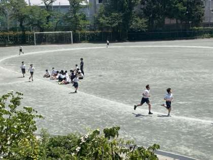 校庭では持久走のタイム測定中です。待っている仲間が「がんばれ!」、「最後まで走りきるぞ!」と大きな声で応援し、回周も伝えています。