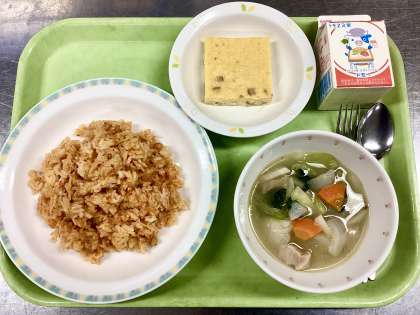 この日はチキンライスをよく食べてくれていました!やっぱりご飯をたくさん食べてもらえると、安心しますね!具は鶏肉・人参・玉ねぎで、味付けは塩・こしょう・醤油・ケチャップと、最後に隠し味でカレー粉を使っています。このカレー粉が美味しさのポイントで、去年は生徒から「何か入っている?」「家で食べるのと違う」といった感想がありました。そのように気にしてもらえると、こちらとしても嬉しいです。
