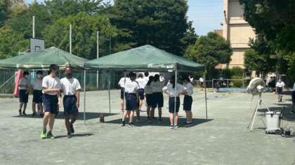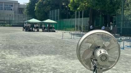 テント、ミストで対策しています。帽子も自由、マスクもです。給水の指示も出しています。