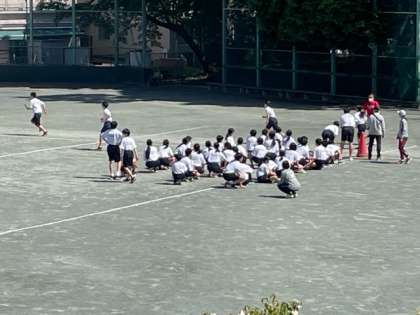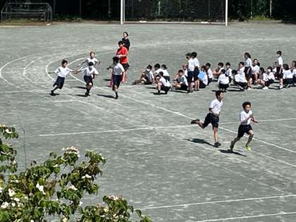 校庭では1年生が全員リレーの練習中です。練習とは言えみんな本気です。応援の声も職員室に届いています。