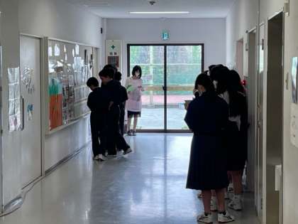 保健室前には眼科検診で1年生が待機しています。静かに養護の先生から受診の説明を聞いています。