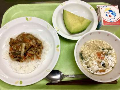 にら玉スープは、「人参・にら・ねぎ」だけと野菜は少なめ、でも「にら」の風味はちゃんと味わえます。そして、豆腐と卵が多めに入っているので、野菜の多いホイコーロー丼のお供としてぴったり!今日も調理員さんたちが丁寧に卵を溶いて流し入れてくれたので、フワフワ!まろやかでごま油の香りもする美味しいスープになりました!
