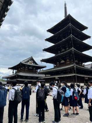 五重塔、金堂、エンタシスの柱についてなどの説明を聞いています。
