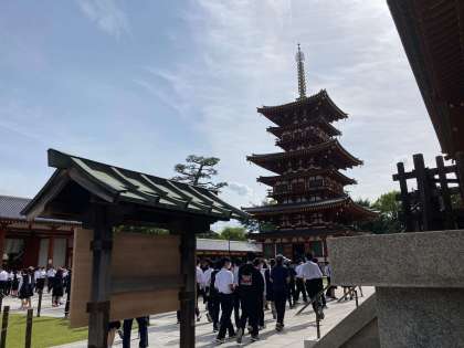 法話の後、薬師寺の見学中です。法話でも聞いた薬師三尊像を見ています。