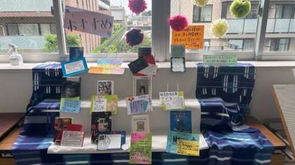 ホワイトボードのイラスト、図書室の本の紹介、なかなかいいですね。