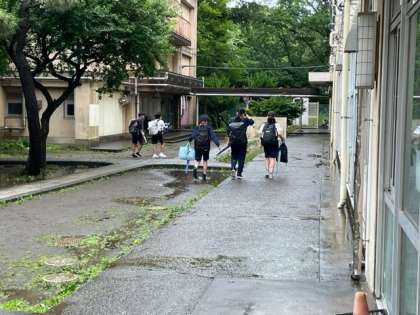時折激しい雨となりますが現在は傘は必要なく下校しています。先生たちも昇降口で気をつけて帰るように声かけしています。
