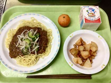 今日は運動会2日前です。みんなの元気が出るようにジャージャー麺を、そして暑さに負けないよう冷凍みかんにしました!冷凍みかんは、他区の小学校では大人気だったのですが、昨年度の砧中学校では、残菜としてけっこう多く残ることがありました。なので今回は、去年のSサイズよりも小さい「2Sサイズ」にしました。