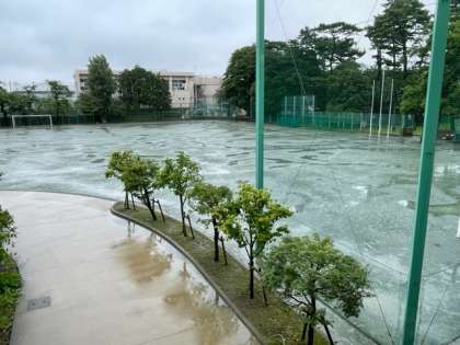 9時過ぎの校庭です。雨も上がりこのまま水が引いてくれれば、午後からの運動会準備もできそうです。