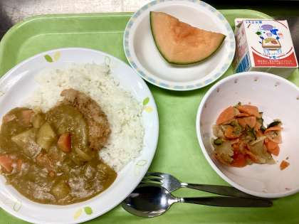 おかずの福神漬けは、大根・きゅうり・人参を茹でてから冷却し、最後に生姜汁・しょうゆ・酢・砂糖・白ごまで和えています。市販の福神漬けは「味が濃くて少量」というイメージですが、給食では野菜が多く、味も適度に付けているだけなので、いつもの「サラダ・和え物」感覚で食べられます。食べて口の中をさっぱりさせてから、またカレーをどうぞ!