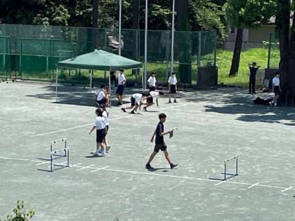 ハードルのスタート位置にテントを設置して暑さ対策をしています。