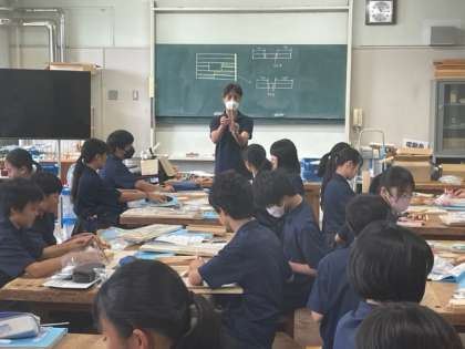 木工室で材料が配られ「さしがね」の使い方を勉強してます。