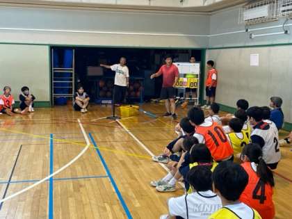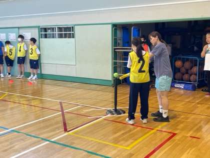 i組のTボール練習はミーティングから始まりました。ルールや技術的なことをみんなで共有しています。