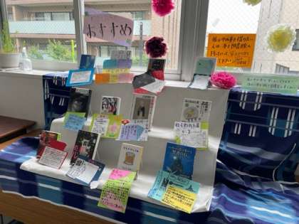 職員室前には図書コーナーが常設されています。新着本のお知らせや、おすすめ本などが紹介されています。考査後は少し夜更かしして読書もいいですね。